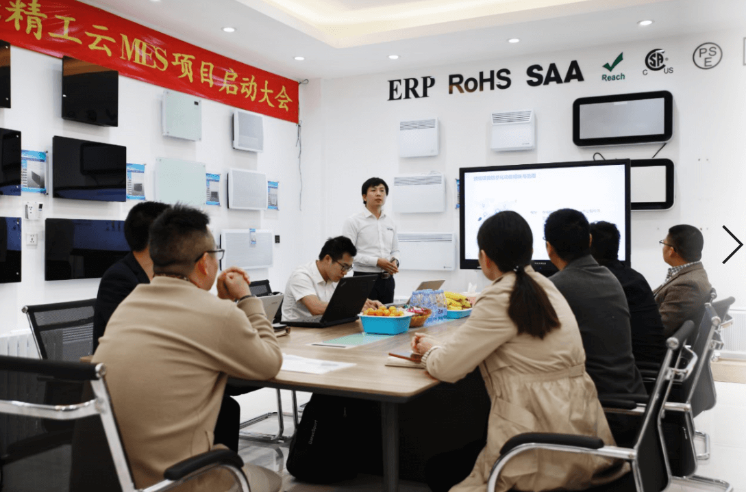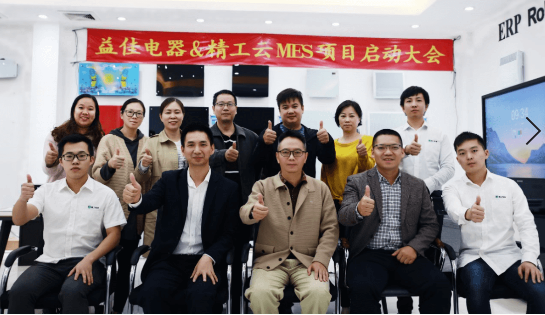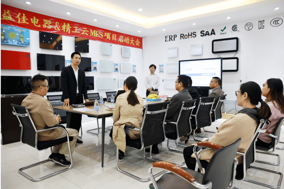2019年11月29日, 中山市益佳电器有限公司举办了精工云MES项目启动大会;益佳电器颜总、王总及各管理层人员、精工项目团队方总及各位项目老师等人参加了此次启动大会。