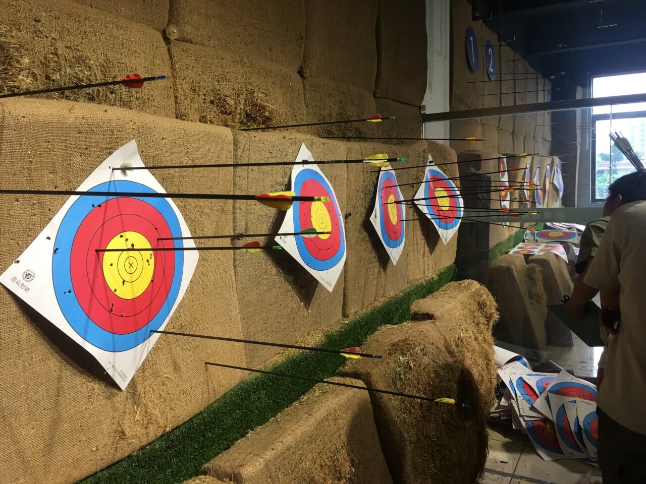 大家磨拳擦掌,誓要拿下第一,场上的握紧弓箭,场外的握紧双手,第一箭射出,熊猫组两名队员都射中箭靶拿下一分,国宝组就差了点偏离了箭靶,一分都没有拿到,出师不利啊~